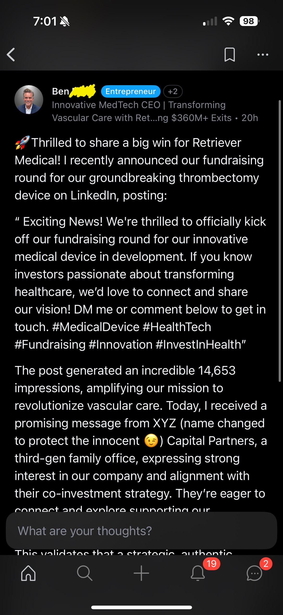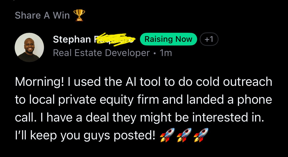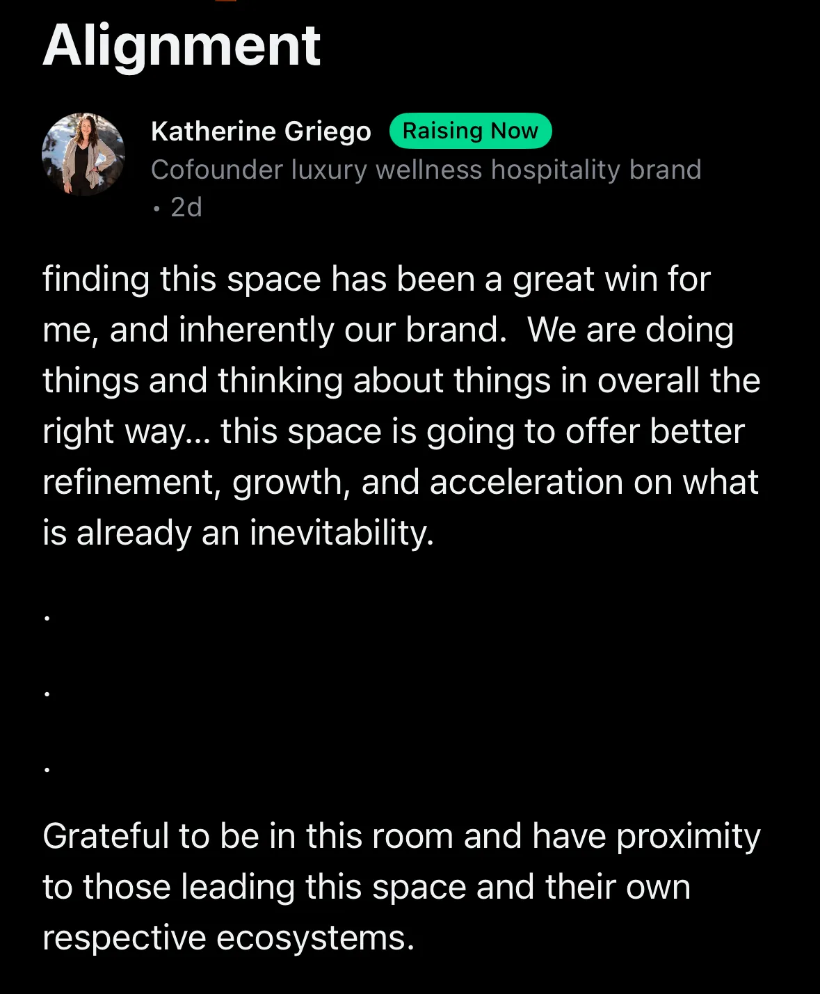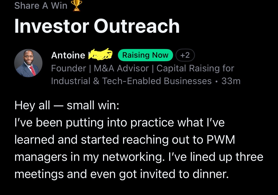 Join an invite-only community of high-caliber founders raising $1M–$50M+. No fluff, no wannabes — just operators building real businesses and closing real capital. Share deal intel. Get investor feedback. Raise faster, together.