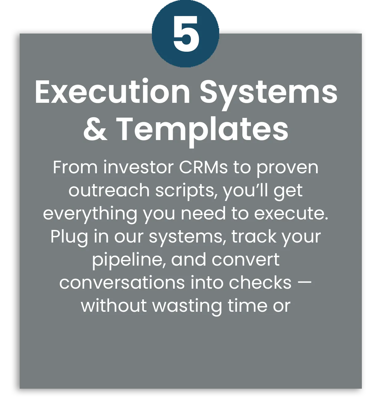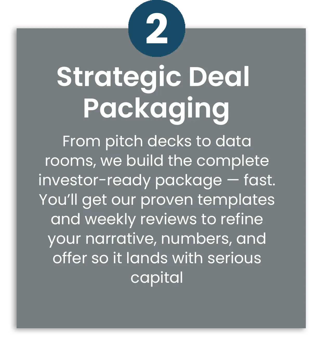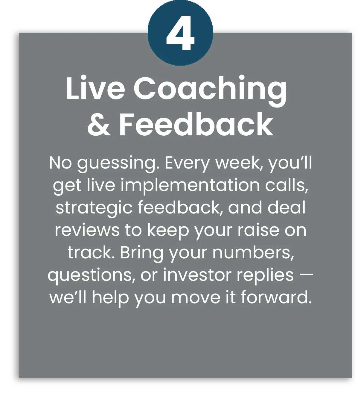 Every week, you’ll meet live with our investor-operator team. Get hands-on help with your pitch, deal structure, investor conversations, and pipeline. Nothing slips through the cracks — we keep you accountable until checks clear.